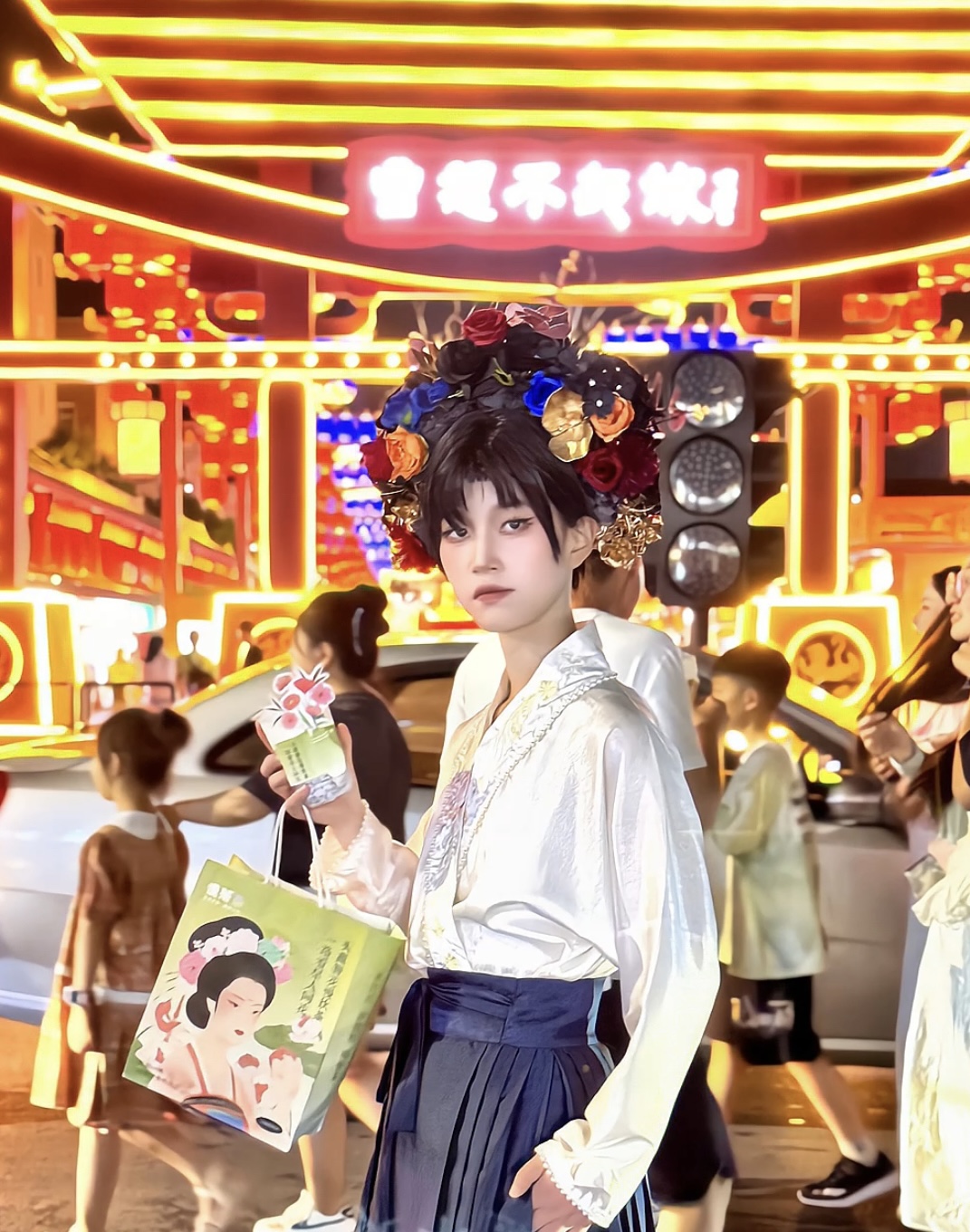 來到曹魏古城,你會看到許多身穿各種朝代或具有地域特色服飾,頭戴簪花的行人們。跨越時空和地區(qū),人們的記憶在曹魏古城這里有了交集。