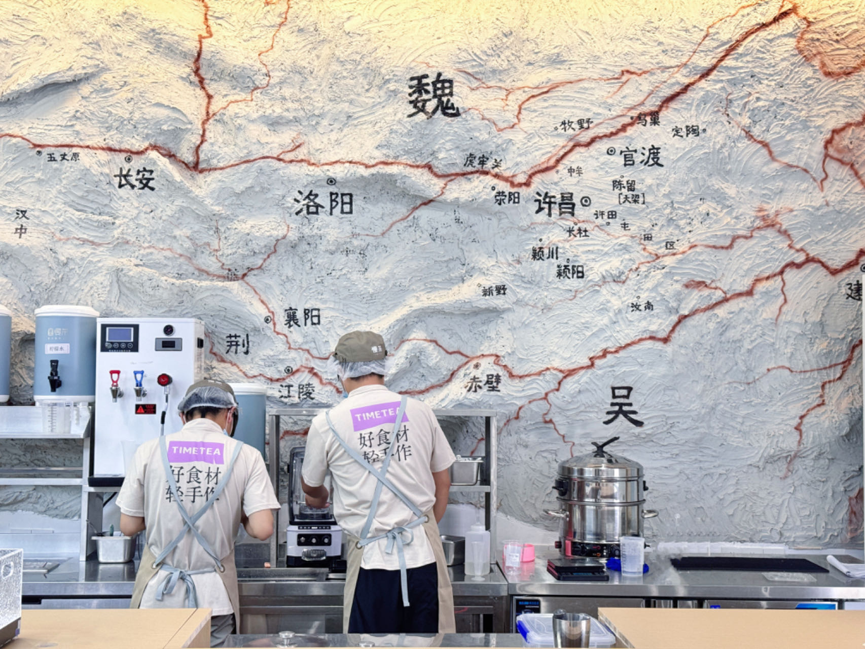 在慢茶曹魏古城門店中,也特別保留一塊地圖墻面,用來展示當時三方混戰(zhàn)割據(jù)的情況,帶每一位到訪的旅者,回到那段烽火連天英雄輩出的時代。