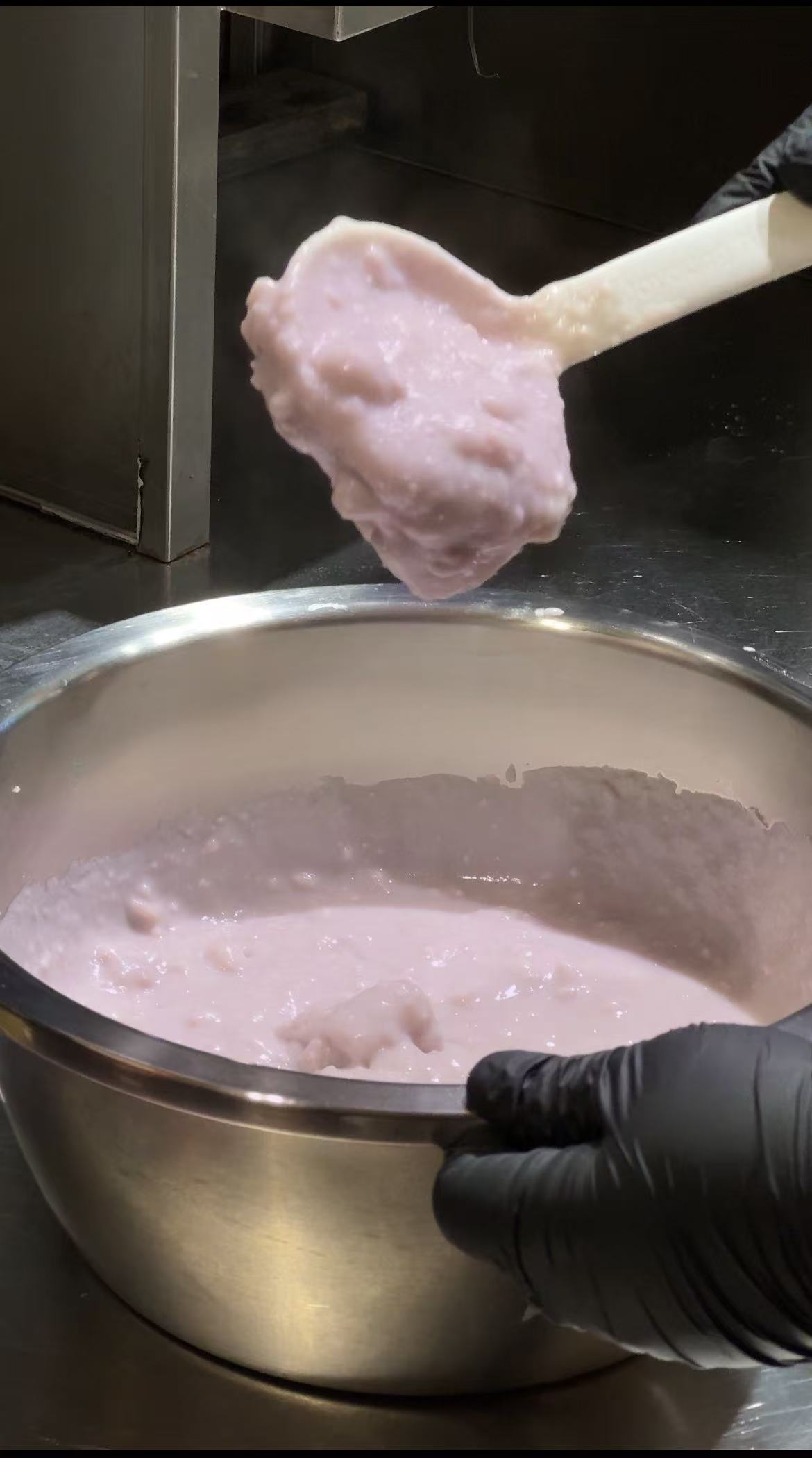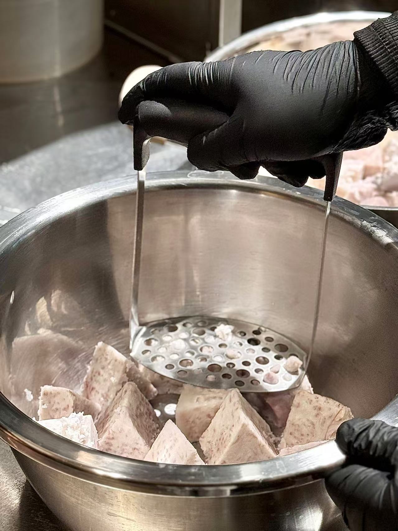 來(lái)自云南哈尼墨江的紫米和來(lái)自廣西荔浦的芋頭成為了搭配,兩種不同的味蕾碰撞,組合成了手作系列的特色飲品——【蒸·厚芋泥紫米奶茶】。