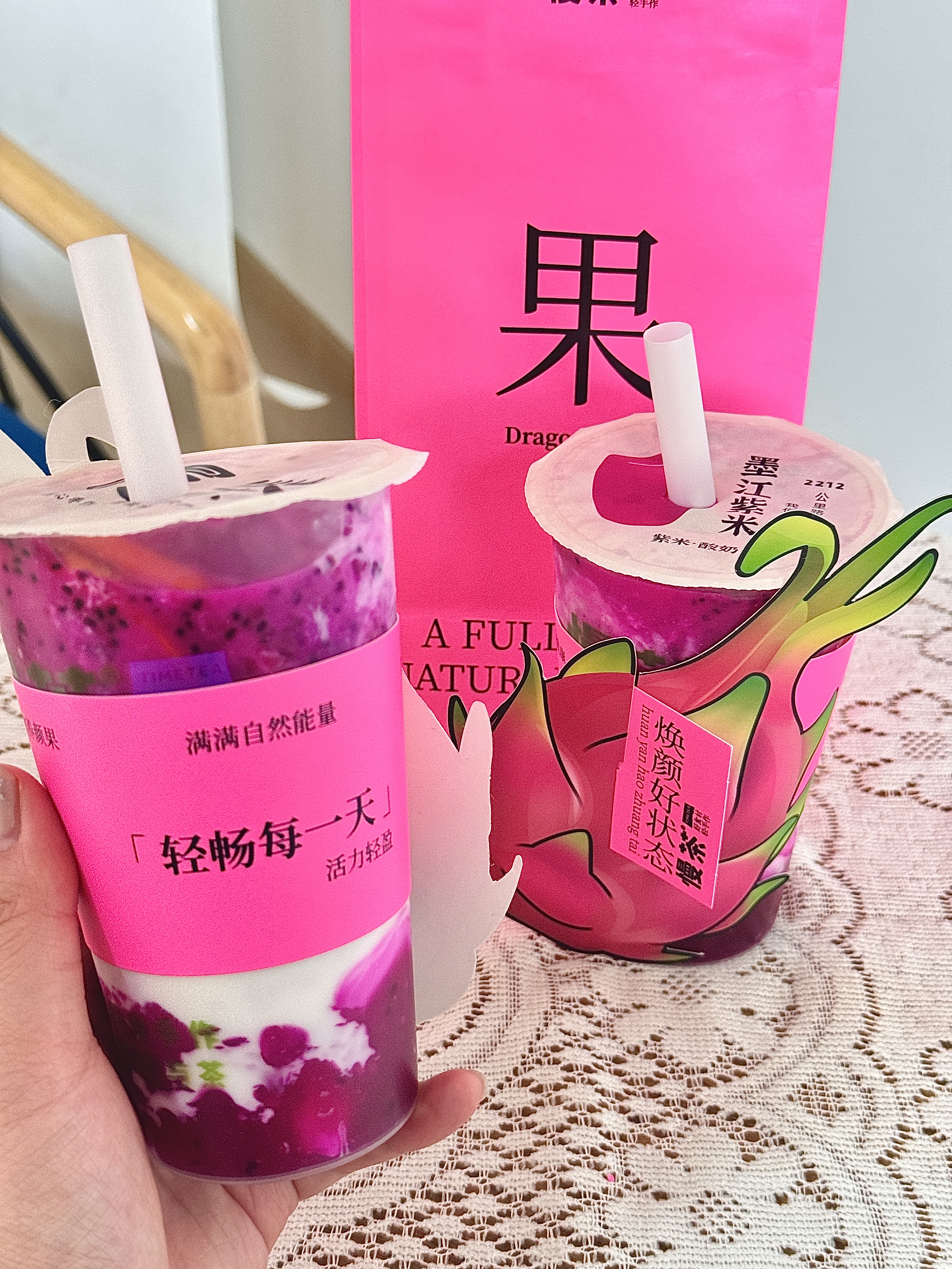 上新的這一天剛好是情人節(jié),這杯亮眼的粉色,還會搭配上我們同色系的單杯紙袋和杯套,非常的好看。出去玩的時(shí)候,來上一杯【超暢養(yǎng)顏火龍果酸奶】,好喝又好看。