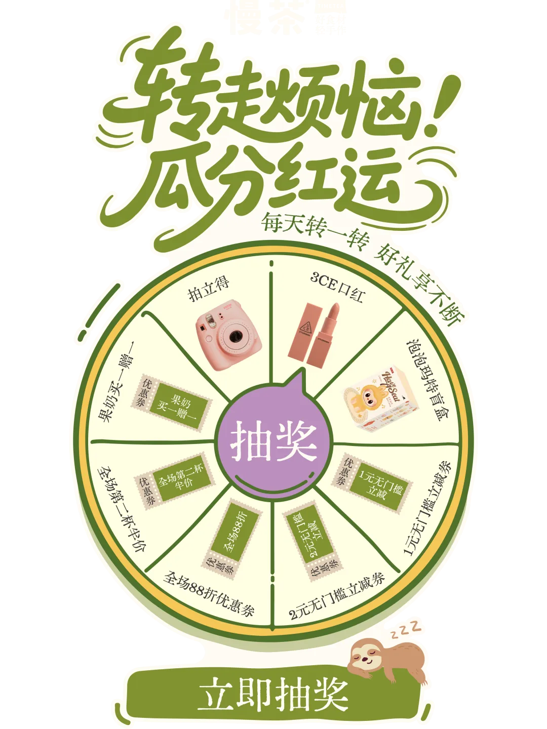 3. 活動(dòng)專享:可在慢茶點(diǎn)餐活動(dòng)頁(或點(diǎn)擊下方抽獎(jiǎng))即可抽取拍立得相機(jī)。
